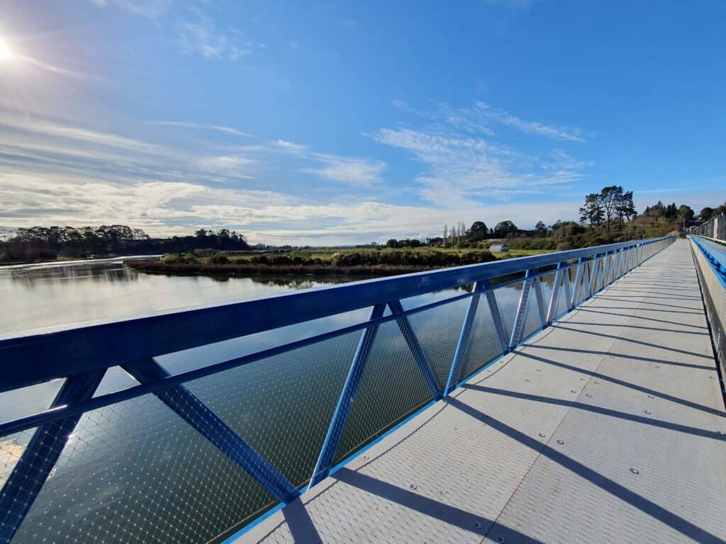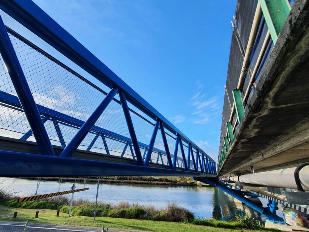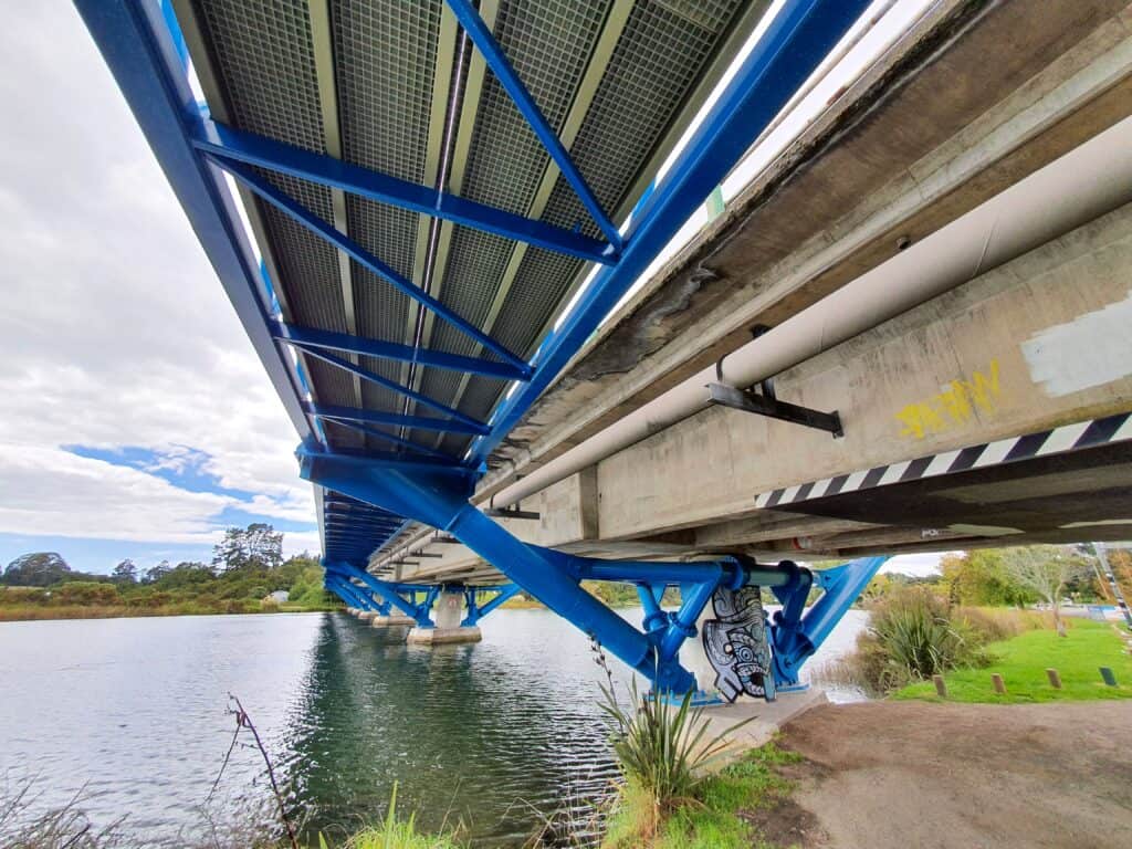 The Waroa Clip-on steel truss walkways are an economic but vibrant cyclebridge solution. The crossing features seven 25m long steel truss bridges to span the Wairoa River attached to the existing road bridge. The concept was the winning solution as part of the successful Brian Perry Civil tender for the overall clip-on works. The vibrant steel warren trusses designed by DC Structures Studio were put forward as an “alternative design” to the original design featuring FRP trusses. The steel truss bridge concept was 50% lighter than the FRP trusses and circa 20% cheaper, which gave Brian Perry a huge commercial advantage over other tenderers. The works were delivered for Western Bay of Plenty District Council and the Waka Kotahi (NZ Transport Agency).
