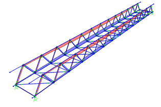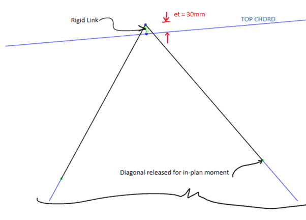 As per Figure 3.2 of CIDECT Guide 1, the gap joints in the Wairoa Truss Bridge have been modelled by allowing for a 30mm vertical eccentricity either side of the chords members. These eccentricities are modelled as rigid members and ensure effects from eccentricities are included in the member design actions. The eccentricity of 30mm is used to enable a gap joint of circa 20mm rather than an overlap joint and thus reduce fabrication complexity. 30mm meets the CIDECT recommended limit of e ≤ 0.25d = 50mm.