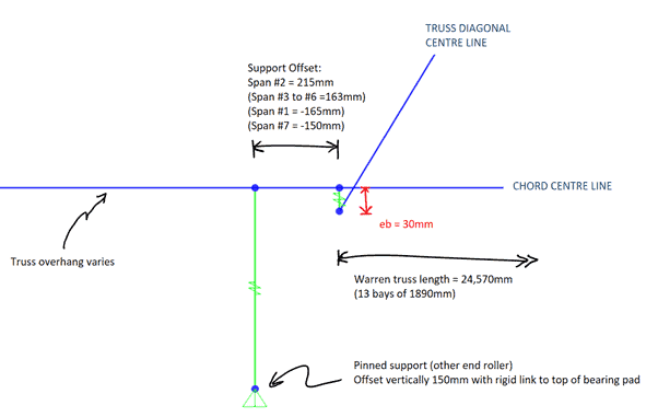 The overall analysis has been based on the Span #2 truss. All trusses have the same 24,570mm long truss configuration with joint nodes spaced 1890mm longitudinally and 1545mm vertical (centre of chord to centre of chord) in a warren truss configuration with 13 bays. To accommodate the span length (measured centre of bearing to centre of bearing), “support offsets” have been included as shown in the figure below.