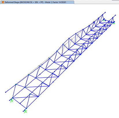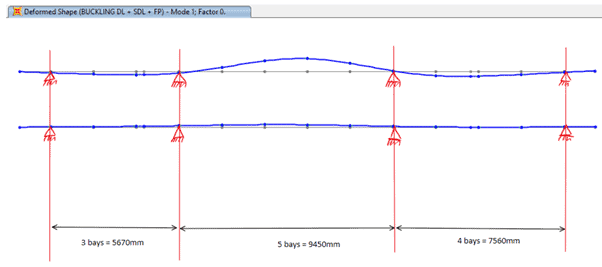 To assess the performance of the U-frame action, a buckling analysis of the “dead load + live load” (SLS1A = DLsteel + SDL + FP) combination was performed and the buckling shape of the top chord was visually inspected to derive a credible top chord effective length. It was found that the factor for buckling of the top chord occurred at 14.5 times the SLS1A condition. As shown in Figures 8-3 and 8-4 below it was found that the top chord buckles as an “n=3” (3 wave) buckling member. Effective lengths were conservatively measured as the distance between points where the inflection crosses the zero transverse movement axis. The critical buckling length has thus been assumed as 5 bays = 9450mm centered over the mid-span. It was noted that if the effective length was measured between the points of inflection, a less conservative critical effective length of 7560mm (4 bays) could be used (shown with dashed lines in the figure below).