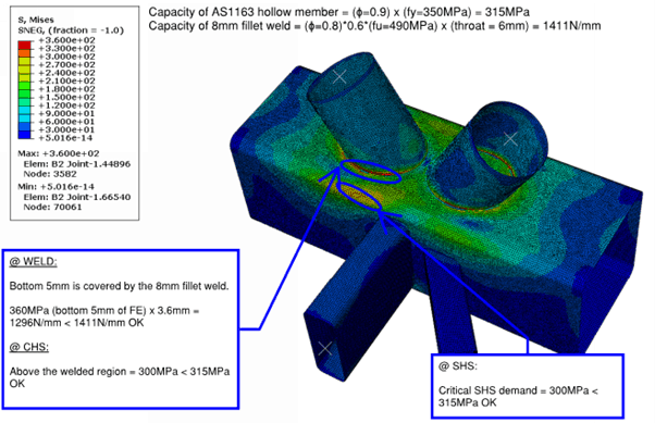 Independent verification modelling was also performed in Abaqus CAE software to confirm the outputs of the Idea Statica software. These results were consistent with Idea Statica as can be seen in comparing Figures below. The 5mm mesh was also used to confirm the critical stresses at the weld region. The maximum weld force was measured as 1296N/mm at the diagonal connection to the truss. This critical weld force is less than the effective strength of a Fu=490MPa 8mm fillet weld (with 6mm throat) which has a strength of 1411N/mm (D/C = 92%). All plates and welds were found to be within code limits and the maximum plastic strain of 0.07% is well below the 5% limit of EN1993-1-5[1].